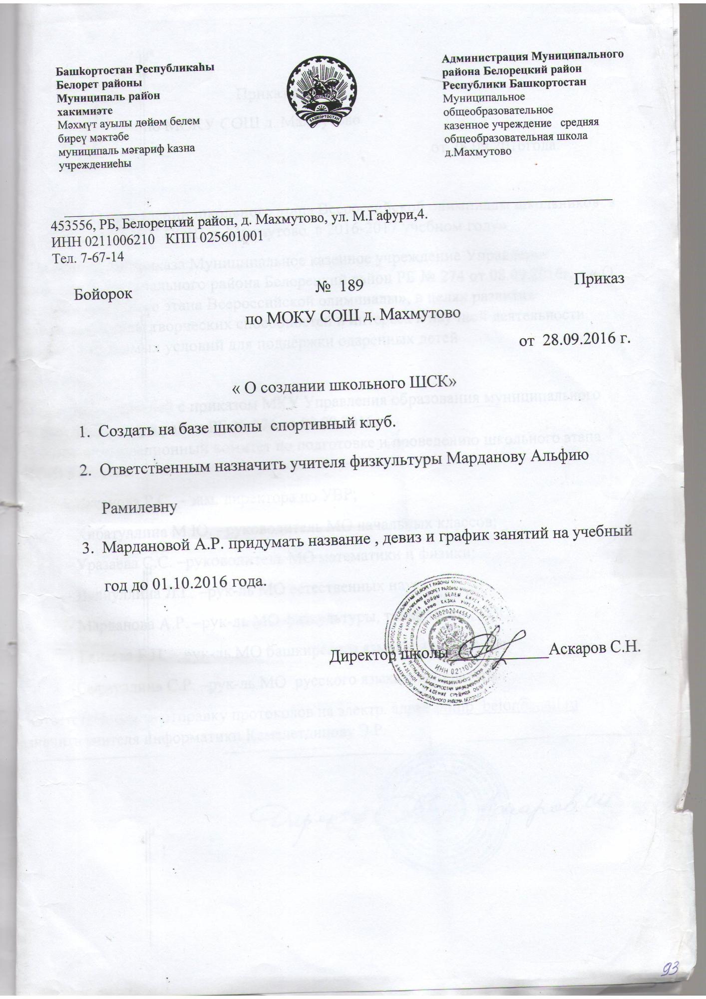 Приказ о создании школьного спортивного клуба